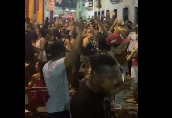As filmagens aconteceram por volta das 19h deste domingo (30) na esquina da Rua do Amparo com a Rua Prudente de Morais, nos Quatro Cantos. A PM foi acionada e conseguiu dispersar os foliões.